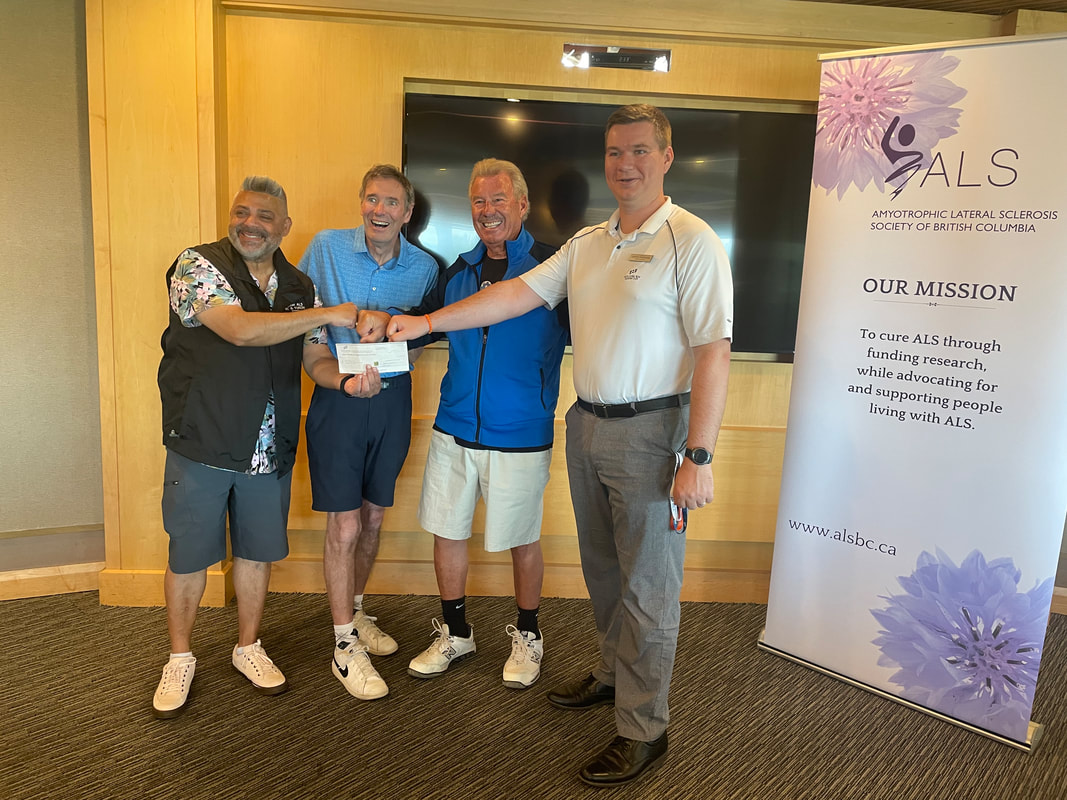 John McCoach, Hollburn Country Club (HCC) Management and the Pickleball Committee attended a ceremony to present a cheque to Navin Autar, Coordinator ALS Society of BC in the amount of $7,500. This donation was as a result of tournament funds raised, including personal donations, during the Spring Charity ALS Invitational Tournament held recently during the weekend of May 26th – 28th. Several Pickleball BC Board members played in the tournament (and donated) including Walter Knecht, President and David Snell, Board Member.
